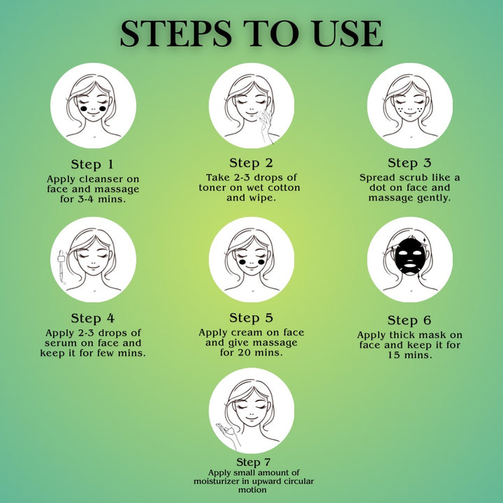 - 7-Steps Anti-Acne Facial Kit: Cleanser, scrub, gel, cream, face mask, and serum – a targeted skincare solution for acne-prone and oily skin.